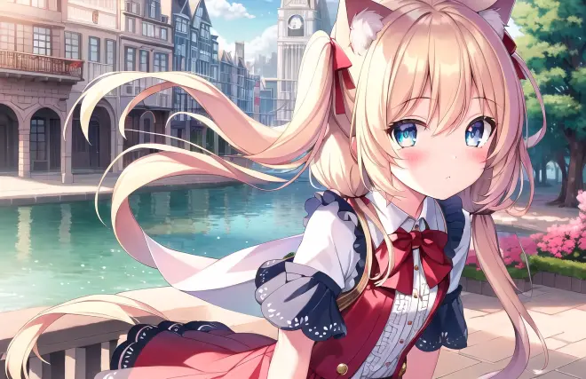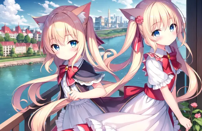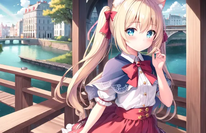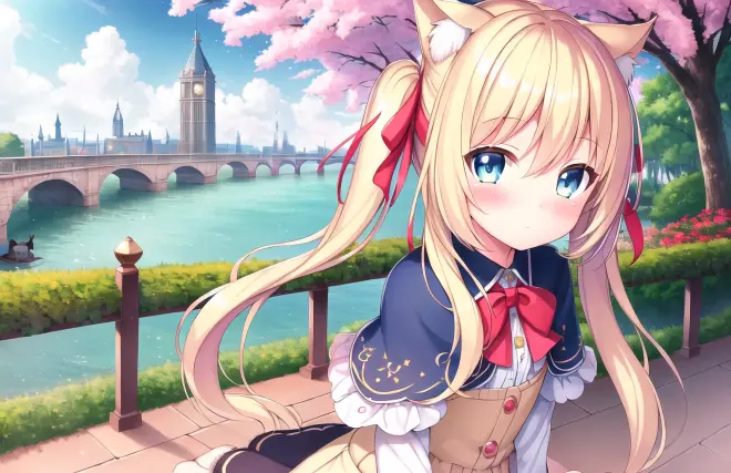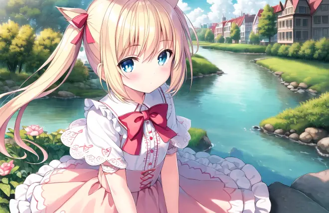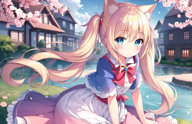 Prompt: (masterpiece:1.2), (best quality), (extremely detailed CG wallpaper:1.2), (best shadow), (depth of field:1.1), colorful,(1girl:1.3),(((loli)),{chird},adorable girl,short girl,(little girl), bule eyes, (light blonde hair),very long hair,folded twintails,cat ear, [hair between eyes], light blush,enmaided_dress,pink capelet,Moderate chest exposure, cardigan, short sleeves,(beautiful detailed face:1.32), (beautiful detailed eyes:1.2), upper body,small breasts,(wariza),spring, river, the best building, beautiful sky, stratocumulus, detailed light