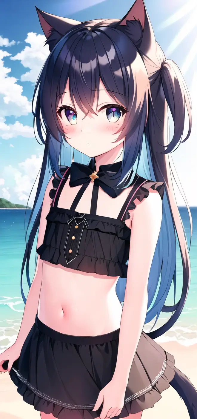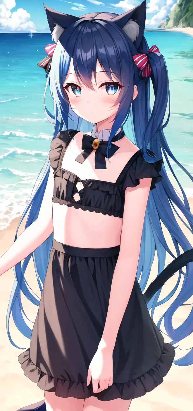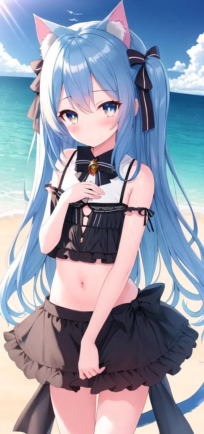 Prompt: (masterpiece:1.2), (best quality), (extremely detailed CG wallpaper:1.2), (best shadow), (depth of field:1.1), colorful,(1girl:1.3),(((loli)),{chird},adorable girl,short girl,little girl, bule eyes, (light skyblue hair),very long hair,short two side up,black cat ears,black cat tail, [hair between eyes], laught,bikini,bule skirt,Moderate chest exposure, (beautiful detailed face:1.32), (beautiful detailed eyes:1.2), upper body,flat chest,(walking),(outdoor),summer, sea, beach, beautiful sky,sand ,blackboard, night, detailed light