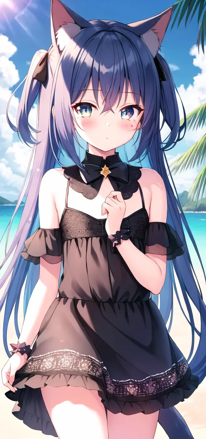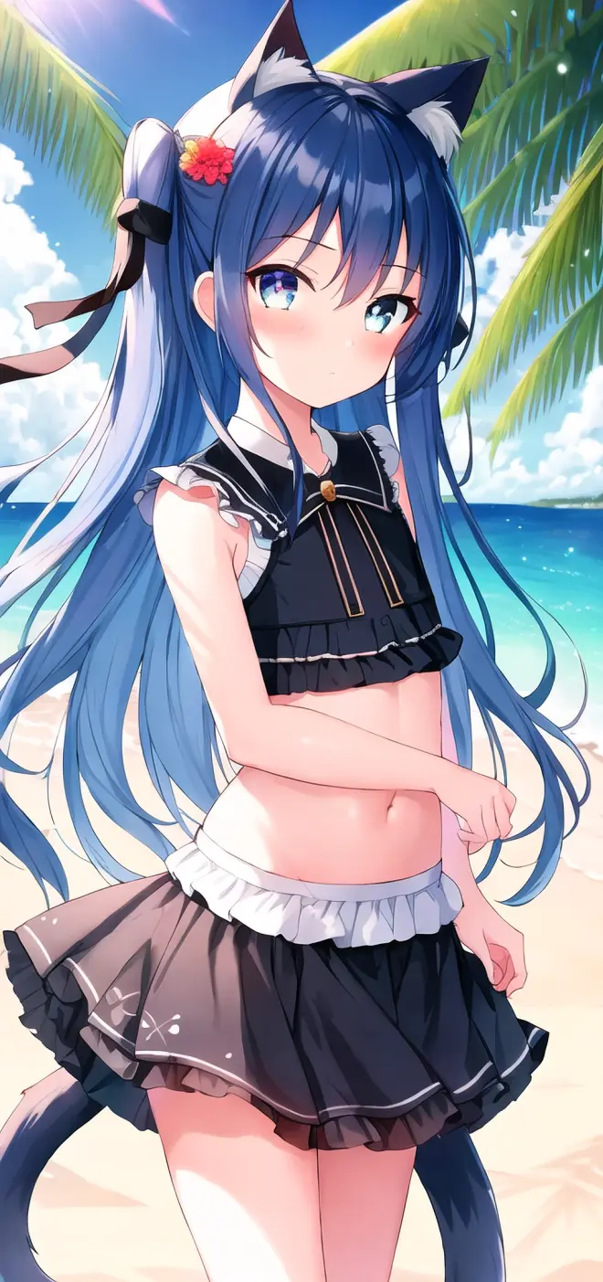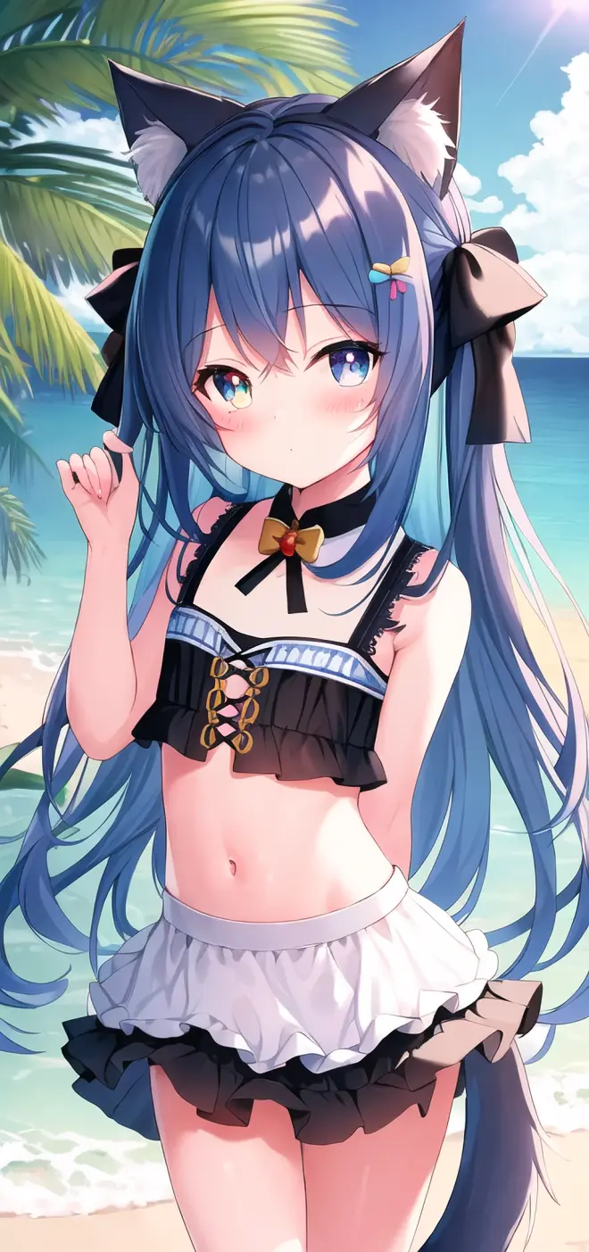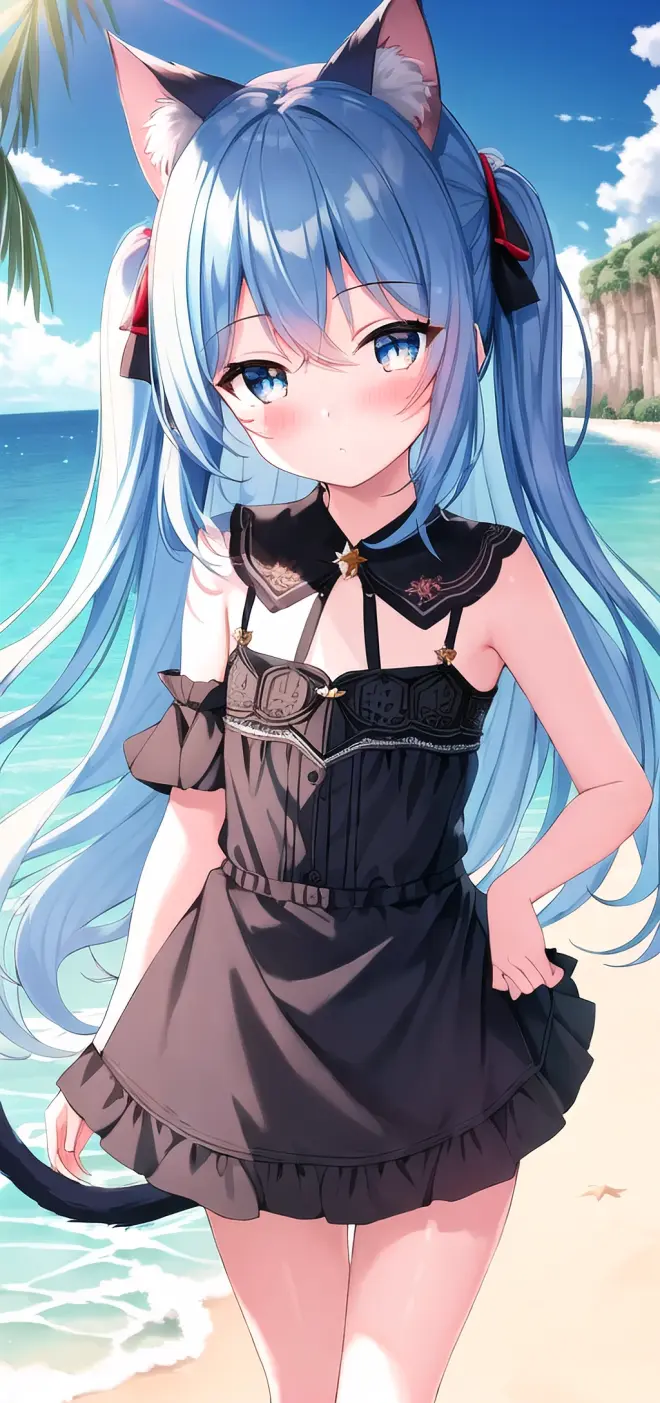 Prompt: (masterpiece:1.2), (best quality), (extremely detailed CG wallpaper:1.2), (best shadow), (depth of field:1.1), colorful,(1girl:1.3),(((loli)),{chird},adorable girl,short girl,little girl, bule eyes, (light skyblue hair),very long hair,short two side up,black cat ears,black cat tail, [hair between eyes], laught,bikini,bule skirt,Moderate chest exposure, (beautiful detailed face:1.32), (beautiful detailed eyes:1.2), upper body,flat chest,(walking),(outdoor),summer, sea, beach, beautiful sky,sand ,blackboard, night, detailed light