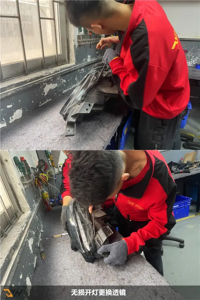 技师们麻溜的把灯光拆下,需要做好相应保护,把大灯专用保护膜贴合灯罩面,以防刮花损坏。
