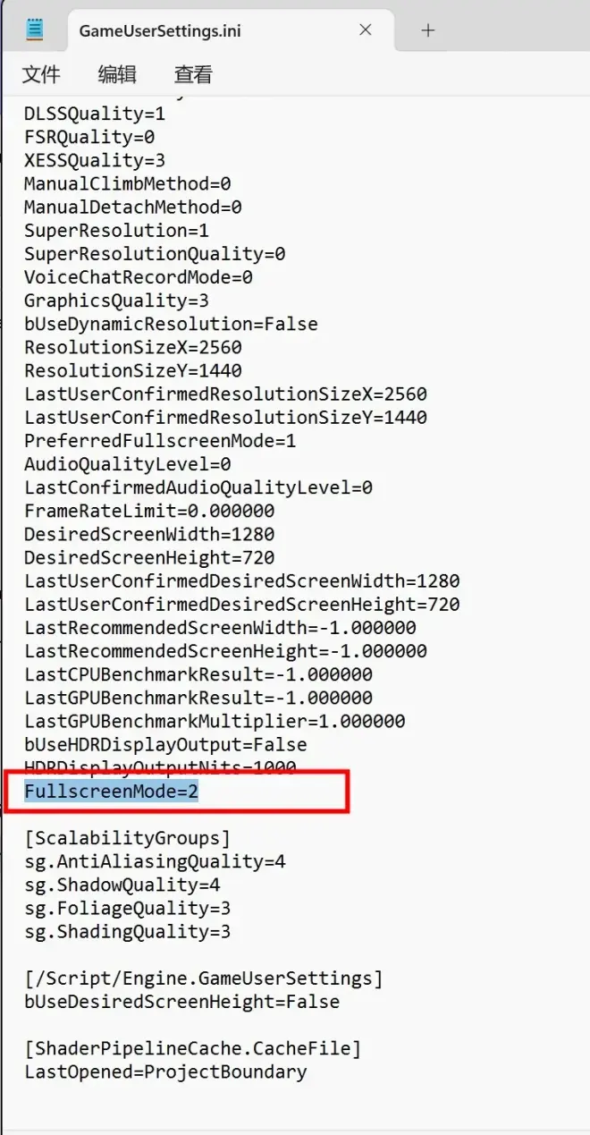 在红框位置新增一行【FullscreenMode=2】,保存后重进游戏