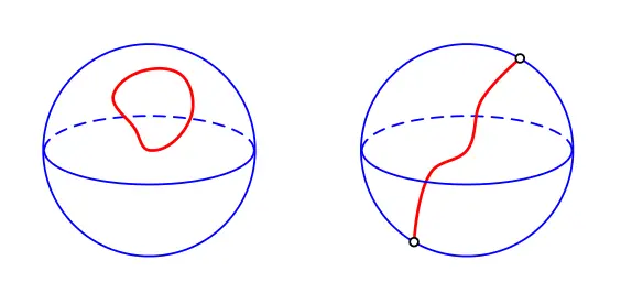 续收缩成一点。右图中的闭合曲线在对径点处发生跳跃,不能连续收缩成一点。