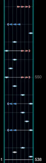由于本曲几乎所有方向键的方向都和绿条移动的方向一样(只有接近结尾的水段不是),所以可以以此记忆方向键的方向;