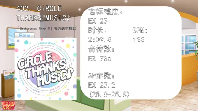 接下来是Backstage Pass 5的活动歌曲,35人大合唱《CiRCLE THANKS MUSIC♪》,评分组这里给到的定数是25.2