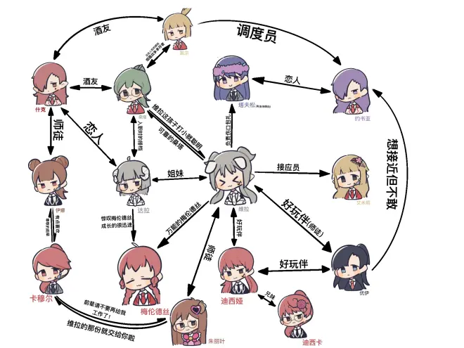 此关系图采用双主角,分别是梅伦德丝和维拉两人,梅伦德丝因为重置太多次所以大部分关系不确定,员工对彼此的评价以第三章为主,之后会开前传。