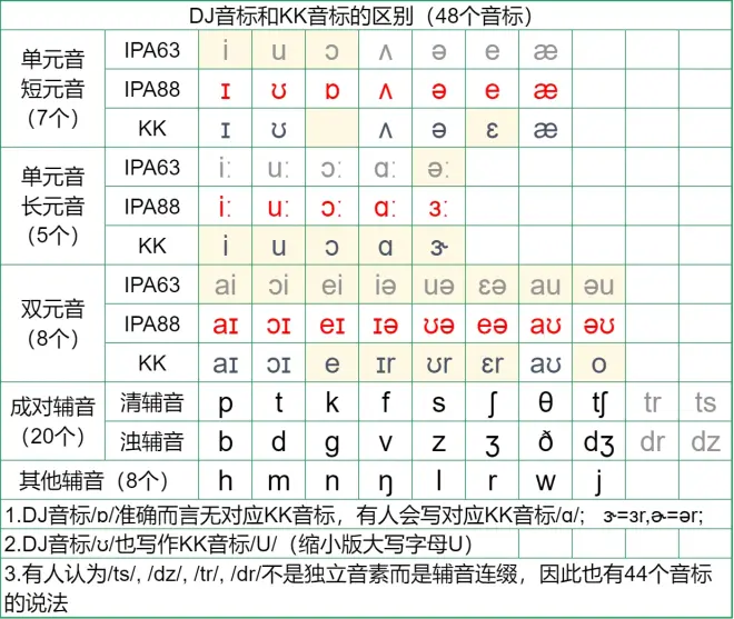2.DJ音标/ʊ/也写作KK音标/U/(缩小版大写字母U) 3.有人认为/ts/, /dz/, /tr/, /dr/不是独立的音素而是辅音连缀,因此也有44个音标的说法