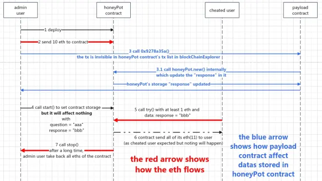分析到这里,我们基本明确了该蜜罐合约的实现原理,即在start之前,通过内联交易更新合约里存储的responseHash值,最后导致start方法传入的response参数无效。