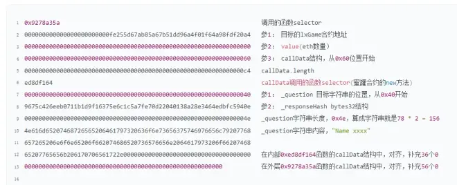 即该函数实际为 function 0x9278a35a(address p1, uint256 ethValue, bytes callData) public payable, 并最终调用到了答题合约的new方法写入了responseHash值