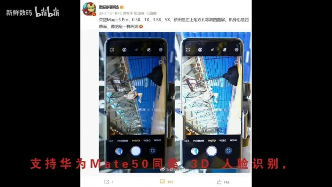 根据之前的爆料和真机泄露,荣耀 Magic 5 Pro 将会采用四曲面屏,前置左上角挖孔双摄,支持华为Mate50同类 3D 人脸识别,支持 0.5X、1X、3.5X、5X 倍变焦。