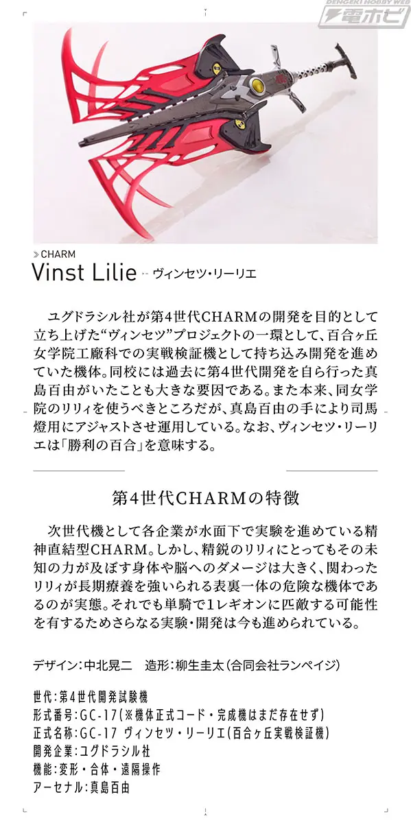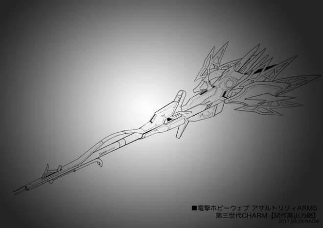 “各所的研究者一直以来都在探索的新型charm,这就是那个理论的答案吗……”剧情中是这么描述的,喂喂喂,你们要的答案就是这比人还大(剧情里都吐槽尺寸过大了,是个缺点),还需要穿上支援套装来减轻使用者负荷的东西吗。那么功能是什么呢,说是得到了新型huge的再生速度的情报后,利用该武器,单兵就能发挥出强大火力将其碾压。那么代价是什么呢,莉莉与charm会产生过度同步的现象,对莉莉产生极大的负荷。而且也不是九世联合战术的竞品。