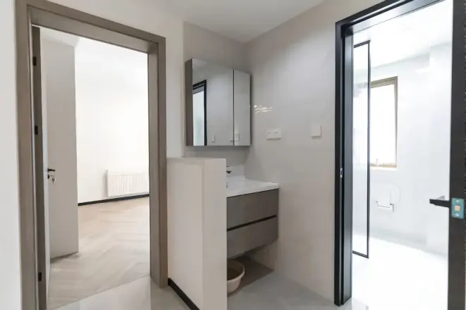 原户型图卧室门位置并不在此,改造后门往左侧略微移动腾出更多空间做干区,二分离卫生间功能划分明确也更加卫生。
