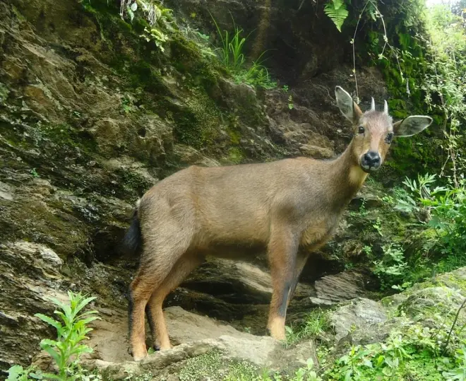 毛冠鹿,因为额部有一簇黑褐色毛冠而得名。身姿优雅,毛冠点缀额头。它栖息于竹丛、草丛、灌丛地带,也在河谷的丛林以及山上的森林中活动。黄昏时活动频繁。它是一种美丽的观赏动物。