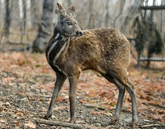 林麝,是偶蹄目麝科麝属中体型最小的一种哺乳动物,又名獐子。雄性上犬齿很发达,四肢细长,后肢长于前肢;林麝常栖息于海拔800~2500米的高山针阔叶混交林或阔叶落叶林中,视觉听觉很灵敏,善于跳跃,并以植物类食物为食物。