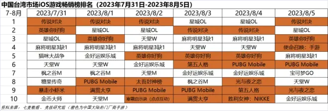 中国台湾市场2023年7月31日—2023年8月5日iOS游戏类畅销榜中,《传说对决》登顶四天。