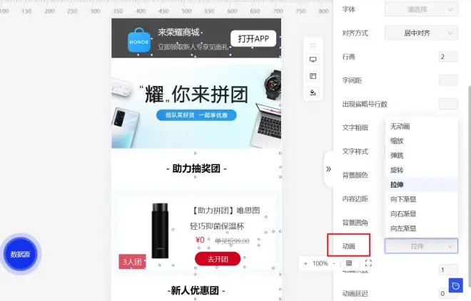 下面以创建荣耀商城618拼团活动页面为例,介绍dooring的功能模块以及基于dooring完成页面搭建的过程,内容如下:
