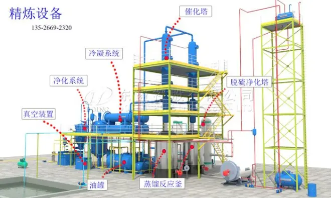 该套日处理量5吨/天的废油精炼由蒸馏釜、缓冲罐、立式冷凝器、卧式冷凝器、油气分离机、水封安全装置、酸碱锅、碱炼锅、水沫除尘器、储油罐以及其他生产辅助设备组成,实现全自动化生产运行,柴油精炼得率在85%左右,柴油品质好。
