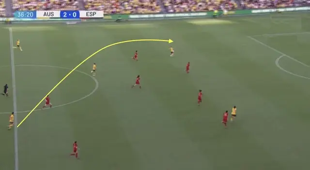 如下图,澳大利亚中场就是利用西班牙的逼抢直接长传制导到前锋脚下。