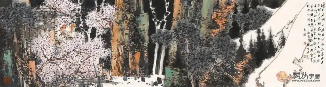 中美协鞠占圃山水画作品创作《桃花过雨水连天》作品来源:易从字画