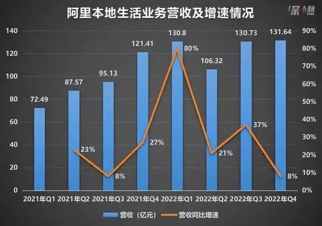 所以,如果仅看2021年Q4之后的数据,可以发现,阿里本地生活业务的营收环比基本没有增长,第二季度甚至降到了106亿元左右。