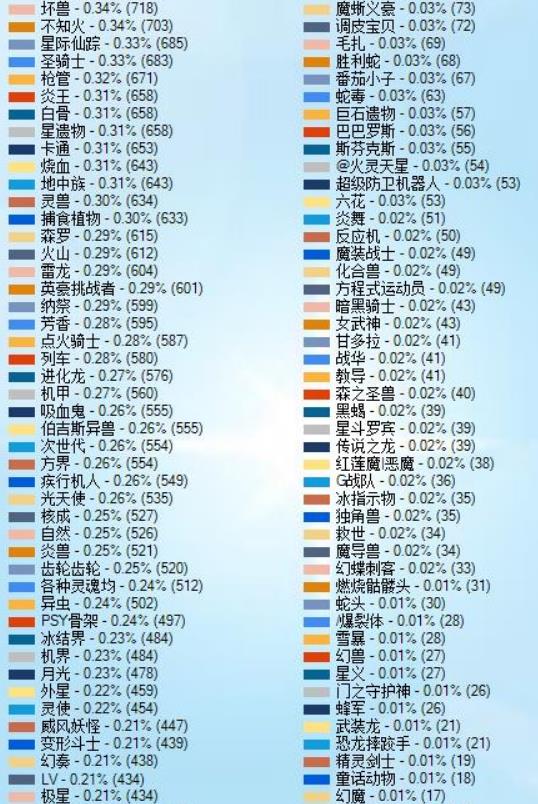 2.英雄仍然是饼图第一。另外这里的英雄包括E/Evil/Neo/V等各类英雄。样本太大了,想尽量减少点分类。实际上真做细分的话,怕是整个饼图能分成114514种。