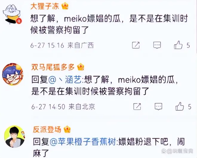 ID名为反派登场、双马尾狐多多、大狸子冻的三位用户称:想了解一下Meiko在亚运会集训期间,因为找PC而被警察拘留的事情。因为话题的劲爆性,吸引了不少路人的注意,由此引发了一场激烈讨论。