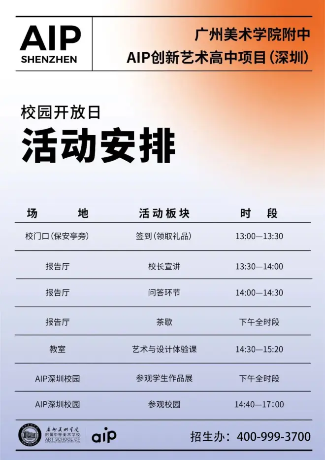 开放日预约方式:考生或家长需进入广美附中AIP国际艺术高中官网填写开放日报名表单,亦可拨打广美附中AIP招生办热线报名。