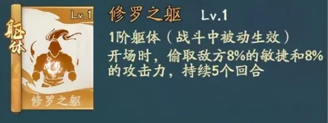 修罗之躯在开场的时候能够偷取敌方8%的敏捷和8%的攻击力,可以持续5个回合,这个神通的技能用来压制一点对面刚好。