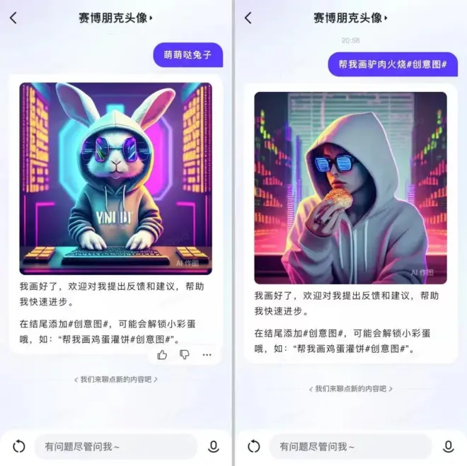 EVA看到文心一言App提示我,可以在提示词加入#创意图#这个字段,能解锁更多新发现,那我再测一个“赛博朋克头像”的创意灵感设计。