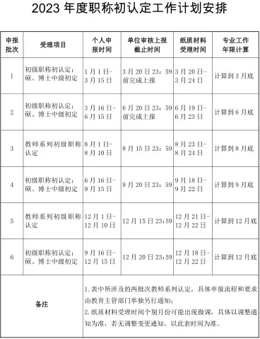 区人力社保局 2023 年职称初(认)定发文安排四次,发文时间为 2023 年 4 月、2023 年 7 月、2023 年 10 月、2024 年 1 月,资格取得时间分别是 2023 年 3 月 31 日、2023 年 6 月 30 7 日、2023 年 9 月 31 日、2023 年 12 月 31 日,专业工作年限计算到当月底。