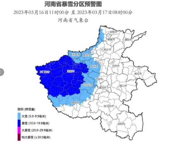 河南省气象台2023年3月16日11时发布暴雪蓝色预警:预计今天白天到夜里,三门峡、洛阳、平顶山、南阳北中部、郑州、许昌西部、济源、焦作西部、新乡西部、安阳西部部分县市将出现5毫米以上的降雪,http://mip.wlchinahf.com/21-0-0-1.html 其中三门峡、洛阳、郑州西部、平顶山西部、南阳北部将出现10毫米以上降雪。请注意防范。