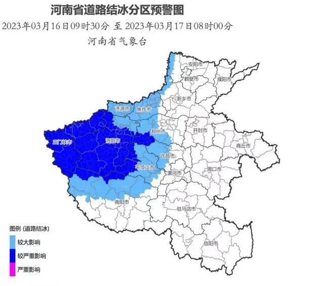 河南省气象台2023年3月16日9时30分发布道路结冰黄色预警:预计今天白天到夜里,中西部和西北部有积雪,路表温度低于0℃,将出现对交通有较大影响的道路结冰,其中三门峡、洛阳、郑州西部、平顶山西部、南阳北部影响较严重。请注意防范。防御指南:1.交通运输、公安等部门应按照职责做好道路结冰应对准备工作。2.驾驶人员应当注意路况,安全行驶。3.行人减少外出,必要外出时尽量少骑自行车,注意防滑。