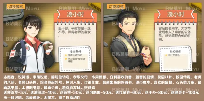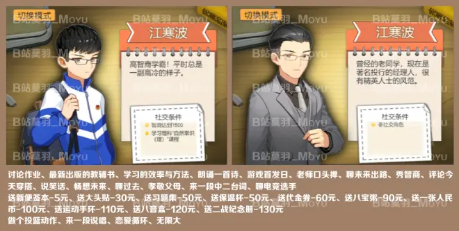 情商达到1500并学习语文课程“写小说”后登场,女生版陪伴每回合+4情商+1/2/3好感度。