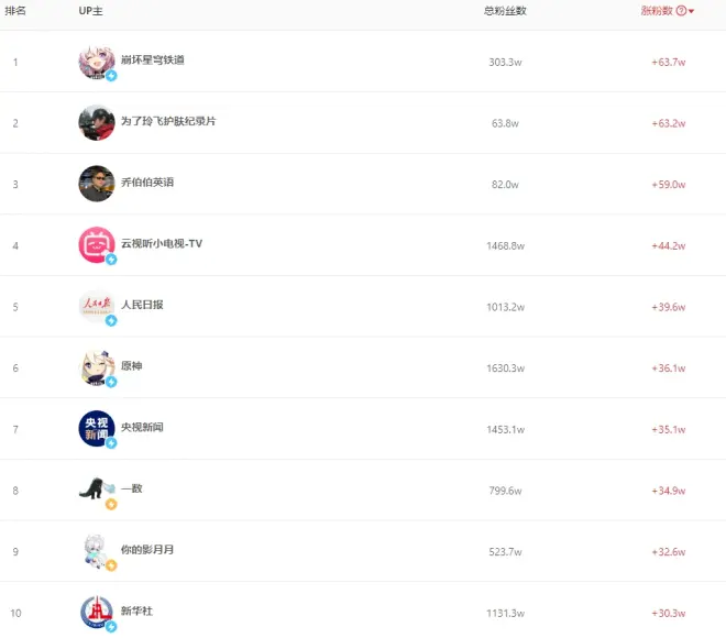 哔哩哔哩月报:23.2月涨粉掉粉排行榜