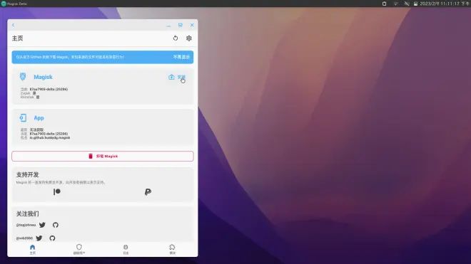 Waydroid Magisk管理器,支持安装、管理Magisk的诸多功能:https://github.com/nitanmarcel/waydroid-magisk