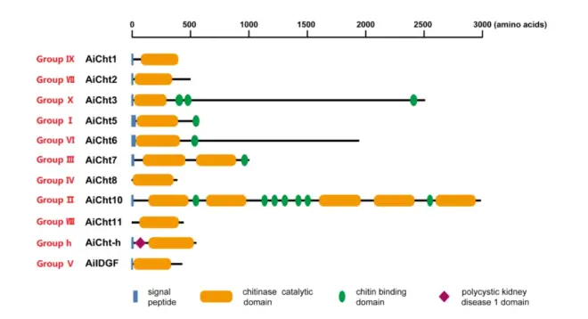 在该研究中,从A.ipsilon转录组中发现了11个几丁质酶基因的全长互补DNA序列。虽然这些几丁质酶的结构域差异很大,但它们都包含至少一个几丁质酶催化结构域。