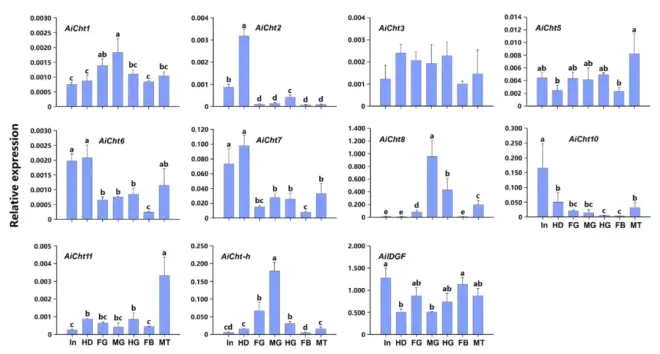 发育阶段和组织依赖性表达谱表明,大多数AiCht在蛹期表达最高。此外,AiCht2、AiCht6、AiCht7和AiCht10主要在外皮中表达,而AiCht8和AiCht-h在中肠中的表达最高。