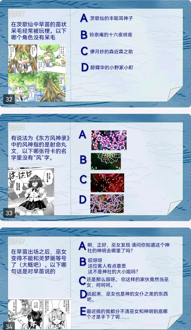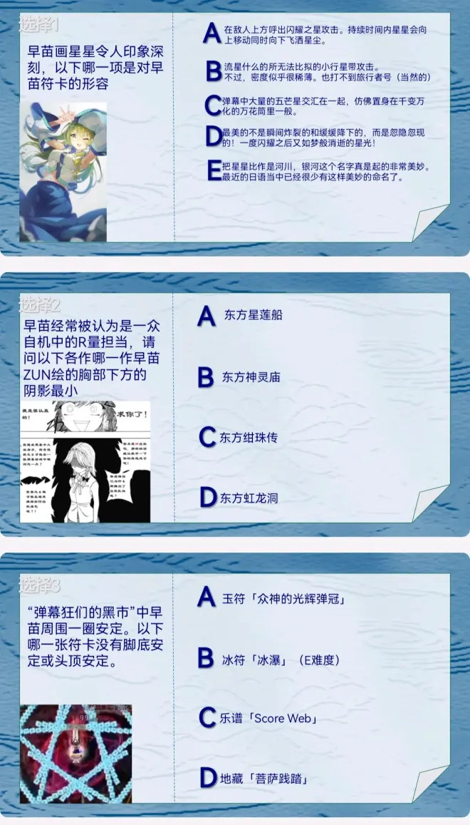 第二次在长T整问答。好像之前3.0打算写类似的总结但最后因为懒没整。和上回星云录写的那个吐槽一样,没啥逻辑的写一下。 上次3.0是30选择+10弹幕连线+22填空。然后当时反馈下来的感觉是人们比较愿意做选择,以及带图的题,所以这次有意增加了下这些的比例。总之是本着加强娱乐性,降低难度的初心出的。实际上最后翻回头看的时候面对题也会吐槽这种东西谁会去记呀一类的。 最后印的那版应该是42道选择,其中22道是去年给长T3.5出的(但当时没用)。最开始其实还有放点花的图片问哪一个是优昙花,放点鸟的图片问哪一个是鸦科这种和东方没有啥大关系的题。当时因为长T3.5是花映冢主题所以背面是幽香,后来长T4.0虽然风神录主题但还是把旧背景继续拿着用了。 然后余下中有10道是星云录时候出的,也就是上学期末,早苗主题。这些其实基本都是以拿PPT放答案为前提出的所以没怎么记答案。当时活动开始有人抽到那道名字里带风符卡的题,我上来解释的时候就把四张符卡的名字全都说错了。不过符卡名我确实是记不住,上回长T3.0各种报错符卡名后我本来想着这次不说名字只说是哪一作谁的,结果忘了星云录还出了这种题。当时问我烟花大会那道题里出现的符卡的名称是什么时我也是毫无印象,而且我答案上烟花大会那题当时也没放解释,甚至我活动前一天晚上熟悉题时好像直接把这题忽略了。 然后提到了早苗安定,就想起当时18.5的时候带纯狐卡刷第四日来解锁其他卡,早苗是那一日我唯一能打过的BOSS,然后就开始疯狂刷早苗打早苗,最后第四日的卡解锁了大半之后,早苗基本都只给我钱不给我新卡了。总之十分感谢神社大小姐的赞助。这次发的票面恰好也是早苗。 不穿袜子那个题,我原本只截了鞋的那一部分,但因为前面已经有黑丝了感觉老只截些这种地方显得我像个变态,就换成了全身图。 之后的裸足那个题其实一开始也有放几个ZUN绘足让人认的想法,但觉得那么整有点怪就没整。另外我感觉裸足就是既不穿鞋也不穿袜子。然后活动前一天泉理和我说小伞那种也算裸足。总之每次都会有这种没想到的有歧义的地方。(这题还打错字了,虽然觉得问题不大) 台词方面。thb现在查游戏对话还是挺方便的,想出台词题基本都是想到什么想出现的关键词,然后把这个词拿来查一下看有没有足够数量的对话出现。像有时候群友出台词题我基本不管见没见过也会去查,然后有一次群友用的那个翻译版本和thb上的不一样(纯狐的一句台词),当时感觉遭遇了检索路上的滑铁卢。 然后是漫画图方面,出的方式是在thb上查相关角色在第几话出场了,再不看内容只看图把这些话飞快的浏览一遍找能用的(有些背景角色还要找一下,比如秋姐妹那种,说起来那个题感觉都没怎么被抽到过,不愧是不人气姐妹)。活动前我还思考了一下要不要把相关情节补一下怕别人问我,但我又想应该没人那么闲吧。结果事实上确实有人问我。 露娜萨梅露兰那个题的扣图我当时用的是PPT自带的那个去背景扣的。三骚灵的头饰颜色和她们衣服扣子是一样的,红月亮蓝太阳绿星星。我当时出的时候还想着这个颜色差别挺明显的(虽然原来也没注意过)。 认咲夜和魔理沙2.0(我还是喜欢上届那个)。咲夜那个题我当时想的是虽然D看不出来但F能判断出来是对的,因为儚月抄里魔理沙的围裙上有兜,然后其他妖精女仆有翅膀而且没有领口的蝴蝶结(实际上这截的好像也看不出来),所以能排除出来。 鸟类相关角色当自机这个题当时没加时间限定也算挺不严谨,其实我还挺希望觉能当自机的。