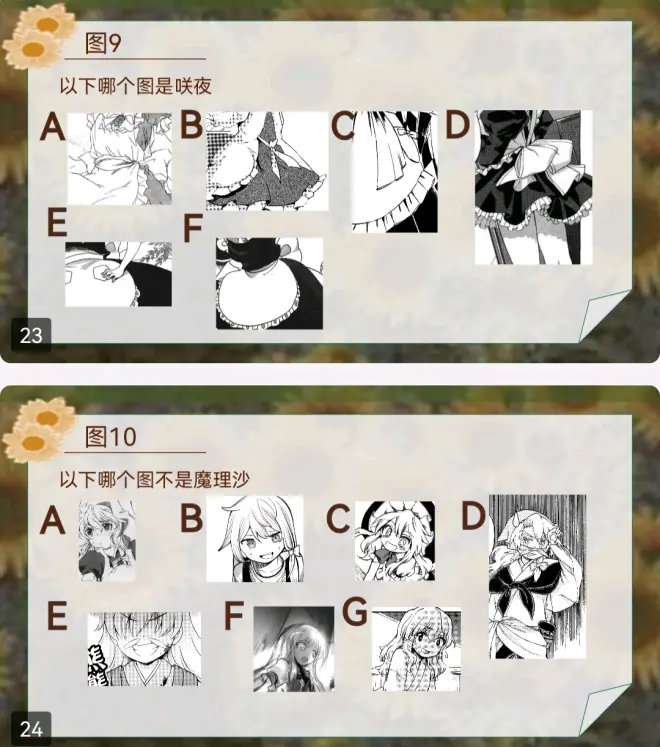 参考答案 1、D A蕾蒂(文花帖)B小野冢小町(花映冢,幽香吐槽小町悠闲的感觉和灵梦很像)C伊吹萃香(绯想天)D灵梦(茨歌仙16话) 2、C A本居小铃(铃奈庵二十六话)B森近霖之助(香霖堂十三话)C咲夜(花映冢对战魔理沙)D灵梦或者魔理沙(香霖堂二十三话) 3、C A咲夜对米斯蒂娅(花映冢咲夜线)B幽香对米斯蒂娅(花映冢米斯蒂娅线)C芙兰对灵梦(红魔乡EX)D魔理沙对米斯蒂娅(花映冢魔理沙对战模式) 4、C A铃仙对堇子(凭依华对战模式)B灵梦击败因幡帝(花映冢灵梦线)C永江衣玖对爱丽丝(绯想天对战模式)D射命丸文对铃仙(绯想天对战模式) 5、B A射命丸文对博丽灵梦(花映冢文线)B露娜萨对琪露诺(花映冢对战模式)C小町对咲夜(花映冢咲夜线)D小町对铃仙(花映冢铃仙线) 6、C A永琳对幽幽子(永夜抄幽冥组)B幽幽子对紫(萃梦想紫线)C梅蒂欣对米斯蒂娅(花映冢米斯蒂娅线)D幽冥组EX 7、B (花映冢 人偶 求闻 妖怪) 8、B 9、C A魔理沙 暗夜飞行B咲夜 花开夜C琪露诺D四季 第六十年的东方审判 10、A A幽香B博丽灵梦C米斯蒂娅D梅蒂欣 11、A A灵梦对紫(紫香花)B铃仙对布都C蕾米莉亚对幽幽子D铃仙对天子E魔理沙对桑尼(三月精开花爷爷那一段) 12、A B Mind Explosion(幻觉的爆发)C劲疾技【Muscle Explosion】筋肉爆破D帕秋莉 圣艾尔摩爆炸(萃梦想故事模式) 图 1、A B山城高岭C露娜D鵺E灵梦 2、C A神子B阿空C梅露兰D神灵庙灵梦表情符E桑尼 3、D A幽幽子B清兰C帕秋莉D露娜萨E赫卡 4、B A 0分 B8分 C3分 D2分 5、合理即可 A米斯蒂娅B诹访子C蛋D金平糖E萃香的头发F瘦马团子(点心)G拉尔瓦的触角H早苗的呆毛 6、A A灵梦B天子紫苑C夜雀摊子D咲夜 7、A A小五B紫C米斯蒂娅D华扇E灵梦 8、C A鬼华扇 B鵺 C文文 D魔理沙E妖梦 F米斯蒂娅 G铃仙 H咲夜 9、F A桑尼B灵梦C小铃D露娜E魔理沙 10、E皮丝 蓝背景(风神录主) 1、A A奇迹「白昼的客星」B魔空「Asteroid Belt」魔理沙C珠符「五爪龙之珠」衣玖D星符「Shooting Sapphire」 斯塔萨菲亚E药符「壶中的大银河」 八意永琳 2、B 3、D 4、C A灵梦B文文D蕾米 5、C A妖怪退治「妖力掠夺者」文花帖ds符卡BGMB 地灵殿EX道中C风神录六面道中D天邪鬼第五六七日 6、A A早苗 B 9 C妖梦D魔理沙E灵梦 7、D 8、B A狱神剑「业风神闪斩」B森符「真·最深的森域」C「里·Crazy Fall Wind」(里·疯狂秋风)D准备「呼唤神风的星之仪式」 9、B A古明地恋对灵梦B饭纲丸龙对早苗C魅魔对灵梦(梦时空)D魔理沙对咲夜E幽幽子对诹访子 10、D 最长时间参考A灵梦星莲船A 390f梦符「退魔符乱舞」B魔理鬼形兽 384f恋符「Master Spark」C咲夜妖妖梦B低速雷 406f时符「Private Square」(个人空间)D早苗虹龙洞/绀珠传 320f蛙符「操纵蛤蟆」E琪露诺天空璋 370f冰符「Cool Sunflower」(凉爽的向日葵)F射命丸文天空璋 380f风符「天狗暴风雨」 11、A B辉针城(9,弁弁,八桥,小碗)C绀珠传(铃瑚,赫卡)D天空璋(9,拉尔瓦,合欢)E鬼形兽(一面)F虹龙洞(三花,玉造) 12、D A桑尼 B小铃 C其他的河童 E小町 13、D见茨歌仙设定图 14、C A神奈子B诹访子C永琳D文文E早苗 15、D A键山雏B秋穰子C神奈子D玉造魅须丸 16、A A除夕日B2013秋C腊月D2022秋 17、C A妖怪之山 ~ Mysterious MountainB明日之盛,昨日之俗D众神眷恋的幻想乡 18、B A神奈子 向神山的贡品 神明B早苗 放入蛇蜕的护身符 人类C诹访子 爆裂赤蛙 神明D秋穰子 生命的丰穰 丰收之神E天弓千亦 空白卡牌 神明F埴安神袿姬 偶像防卫队 神明G纯狐 纯粹的自信 神灵H依神女苑 不可抗拒的朱丽安娜羽扇 疫病神 19、D A赫卡提亚(与纯狐) 噩梦日记 绀珠符「纯粹与不纯的弹幕」B八坂神奈子 文花帖ds姬海棠果 御柱「Meteoric Onbashira」C 秋符「Fall in Blast」 秋静叶D无何有的进化 上白泽慧音 20、B A星莲船ED B诹访子格斗作符卡 C神奈子文花帖ds符卡 D早苗格斗作技能 E铃奈庵蟒蛇