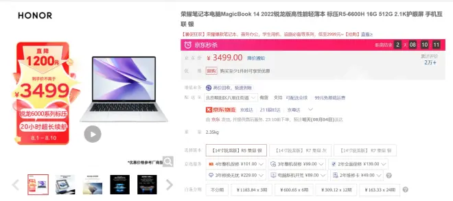 1:荣耀magicbook14 2022 锐龙版 京东3499 拼多多3209