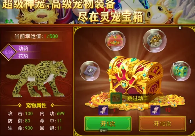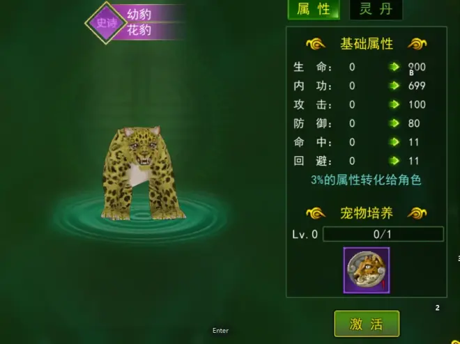 龙猫:是系统的初始宠物,也是免费赠送的!一般系统赠送的宠物自身属性都不会高,所以龙猫是属于普通品质的宠物,评分较低,伤害也不高。可以将1%的属性转化给角色,对玩家的实力提升有限,还是有很大上升空间的!