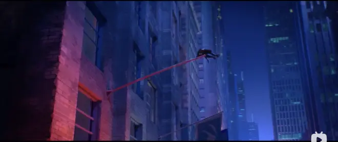 远景看蛛丝逐渐落在楼顶,此时给的大景别的目的是为了铺垫蛛丝起作用的高潮部分,将画面拉远可以起到更加客观的观看效果。