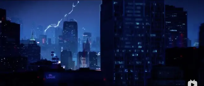镜头在水平方向移动,交代地点 & 环境 (高楼大厦 & 电闪雷鸣夜)