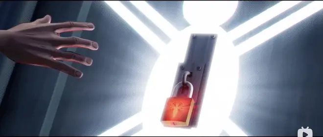 镜头目的:锁上的发光蜘蛛标志揭示棚屋的使用目的和使用者身份