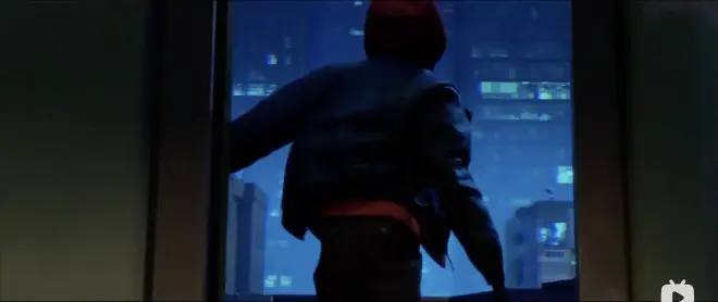 这里的镜头拍摄蜘蛛战衣,通过玻璃反射将主角面部与战衣面具进行重合:表达主角的身份 & 决心。