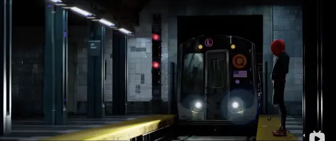 动态设计:主角站在画面右侧不动,和向前的地铁产生反差,有种孤独感(?