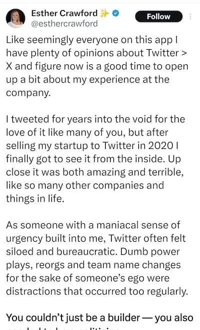 很多关于老推特运作拉垮,办公室政治风行,胆小无能,啥都不敢做,等等。真的很有感触。
