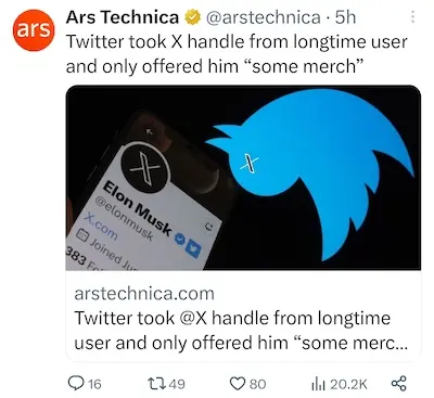 推特公司自己的主账号 @Twitter 退役了,新的主账号 @X 上线。@X 账号是一个旧金山的一个摄影师2007年注册的。老马半点唧唧歪歪都没有,基本就是直接通知他,你的账号我们要了,给你点时间注册一个新的,我们会把你原来的历史数据迁移过去,再给你一点推特的周边,没了。尽管,推特的用户使用条款里早就有这一条(很早就有,不是老马加的)但是整个操作还是一点人情味都没有。这从一个侧面反映了老马一贯的作风,在条件允许的情况下,雷厉风行,不唧唧歪歪,不讲人情。和他的理工直男和亚斯伯格自闭症有关。在远处看着他轰轰烈烈不错,但到了近处,我们一般人十有八九受不了,会被太阳烧伤。
