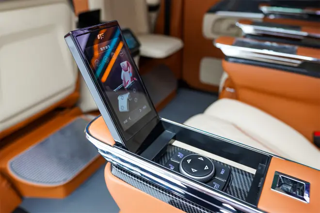 宽大的航空座椅,配上一键BOSS脚踏,身高2米的大哥依然能舒适乘车。通风、加热、按摩、腿托、无线充电都标配了,扶手的屏幕就能控制。