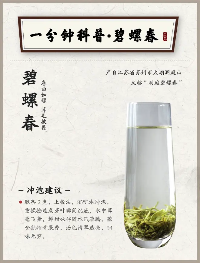 淡中寻味,正是碧螺春的妙处。细品之下能感受到绵密馥郁的花果清香,若似青榄,鲜中带醇,却又即时生津回甘生出一线悠长的甘润。