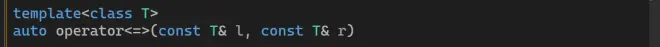 若操作数为整型,则运算符的返回值是std::strong_ordering类型:其中strong_ordering::equal表示左右相等,strong_ordering::less表示左小于右,strong_ordering::greater表示左大于右。